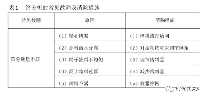 筛分机在工作中常见的故障、原因及消除措施表 1。