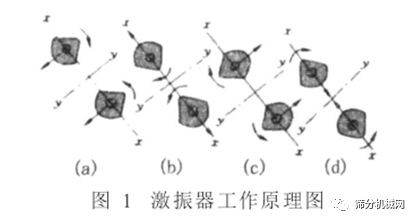 在图1中(a)和(c)位置上,每根轴上两不平衡重块的离心力完全叠加,激振力最大,而(b)和(d)位置上离心力完全抵消,激振力为零。