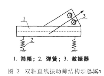 双轴直线振动筛的结构如图2所示,振动器的振动方向与筛面成一定夹角(一般在30~ 60°之间),,因此可使物料在筛面上定向抛射并松散、透筛和向前输送,以进行筛分。